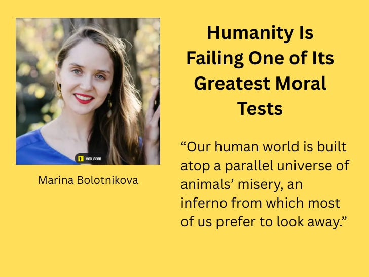 In that spirit, I’d like to share some excerpts from an essay written by Marina Bolotnikova, an editor at Vox, an online publication that runs laps around the rest of the mainstream media in its coverage of the cow-, chicken- and fish-killing industries.